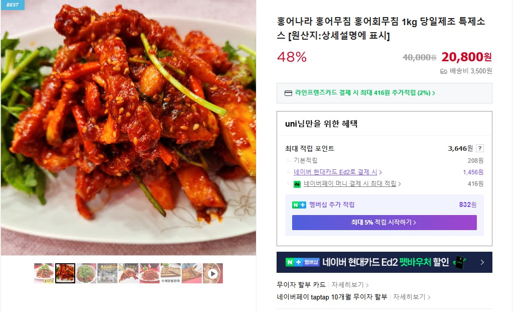 - 홍어무침 가격: 1kg 20,800원